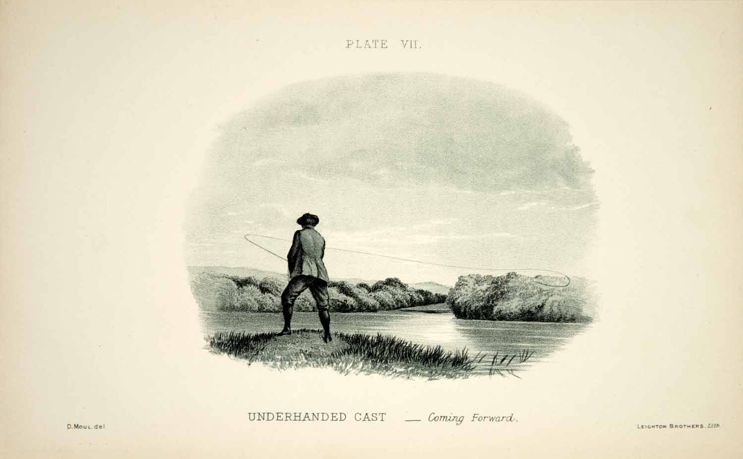 This is an original 1889 grayscale chromolithograph of an illustration by D. Moul entitled, “Underhanded Cast – Coming Forward”, that portrays an angler demonstrating proper form during an underhanded cast.