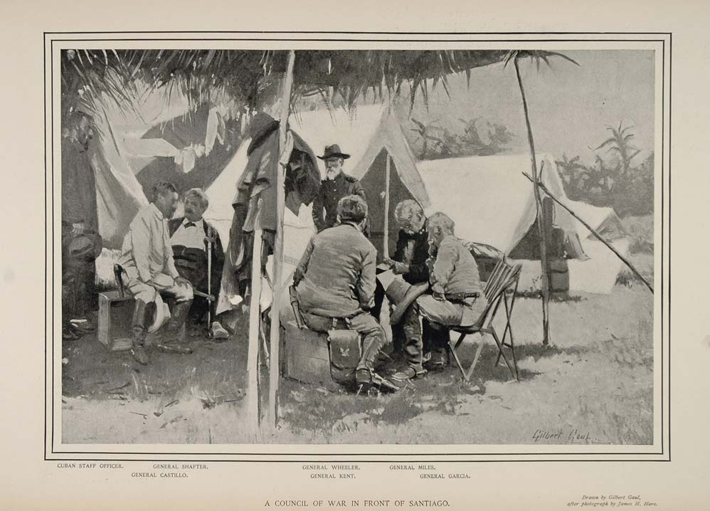 This is an original 1900 black and white print of a council of war meeting in front of Santiago, Cuba, during the Spanish-American War of 1898. The figures identified include: General Shafter, General Castile, General Wheeler, General Kent, General Miles, and General Garcia.