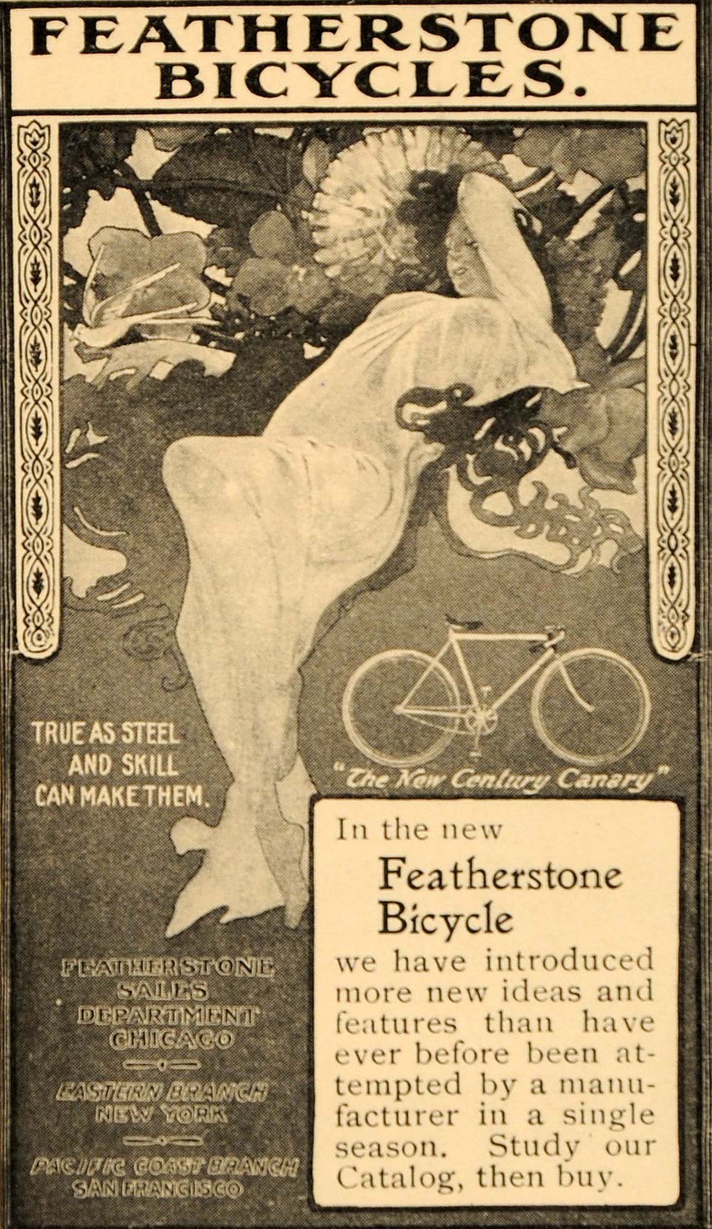 This is an original 1901 black and white print ad for Featherstone Bicycles by the Featherstone Sales Department of Chicago also located in New York and San Francisco. “True As Steel and Skill Can Make Them.”