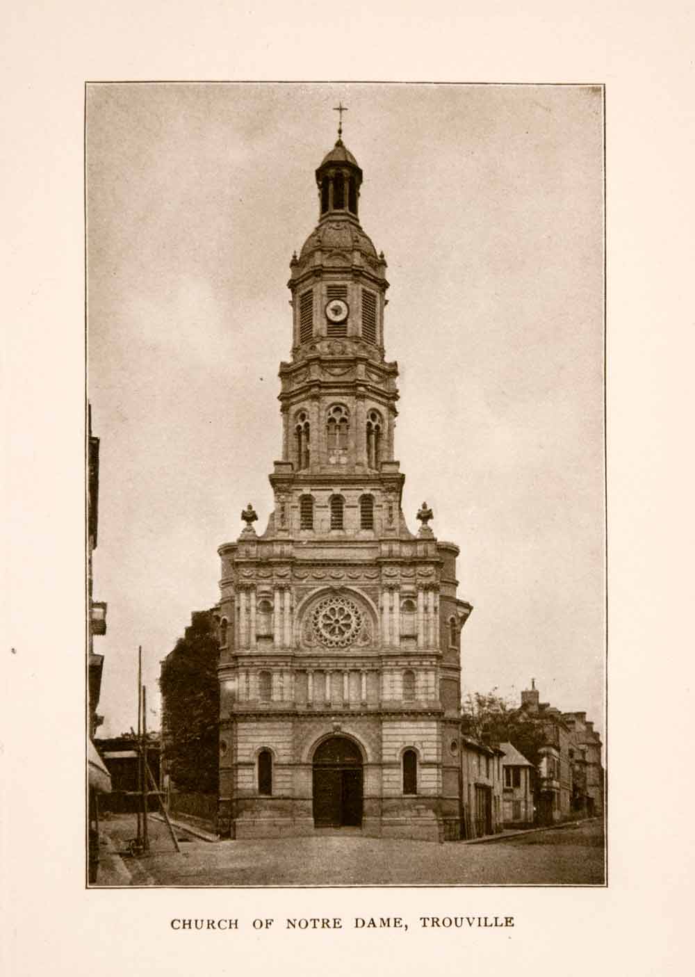 This is an original 1905 black and white halftone print of the beautiful church of Notre-Dame located in Trouville, France.