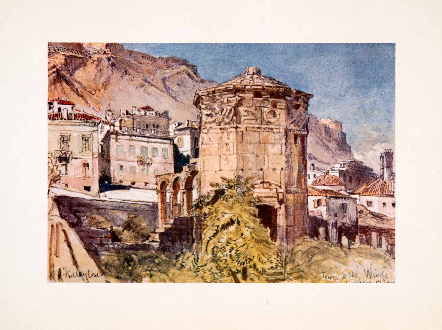 This is an original 1906 color print of the Tower of the Winds in Greece. To the left, part of the aqueduct is visible and in the background the Acropolis is visible.