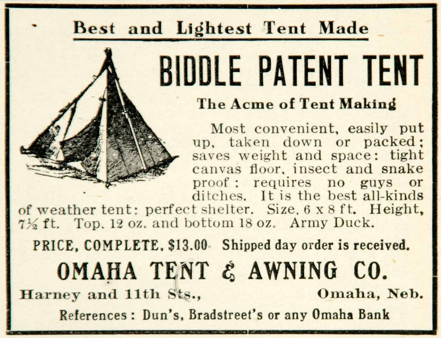 This is an original 1910 black and white print ad for the Biddle patent camping tent that was made by the Omaha Tent & Awning Company.