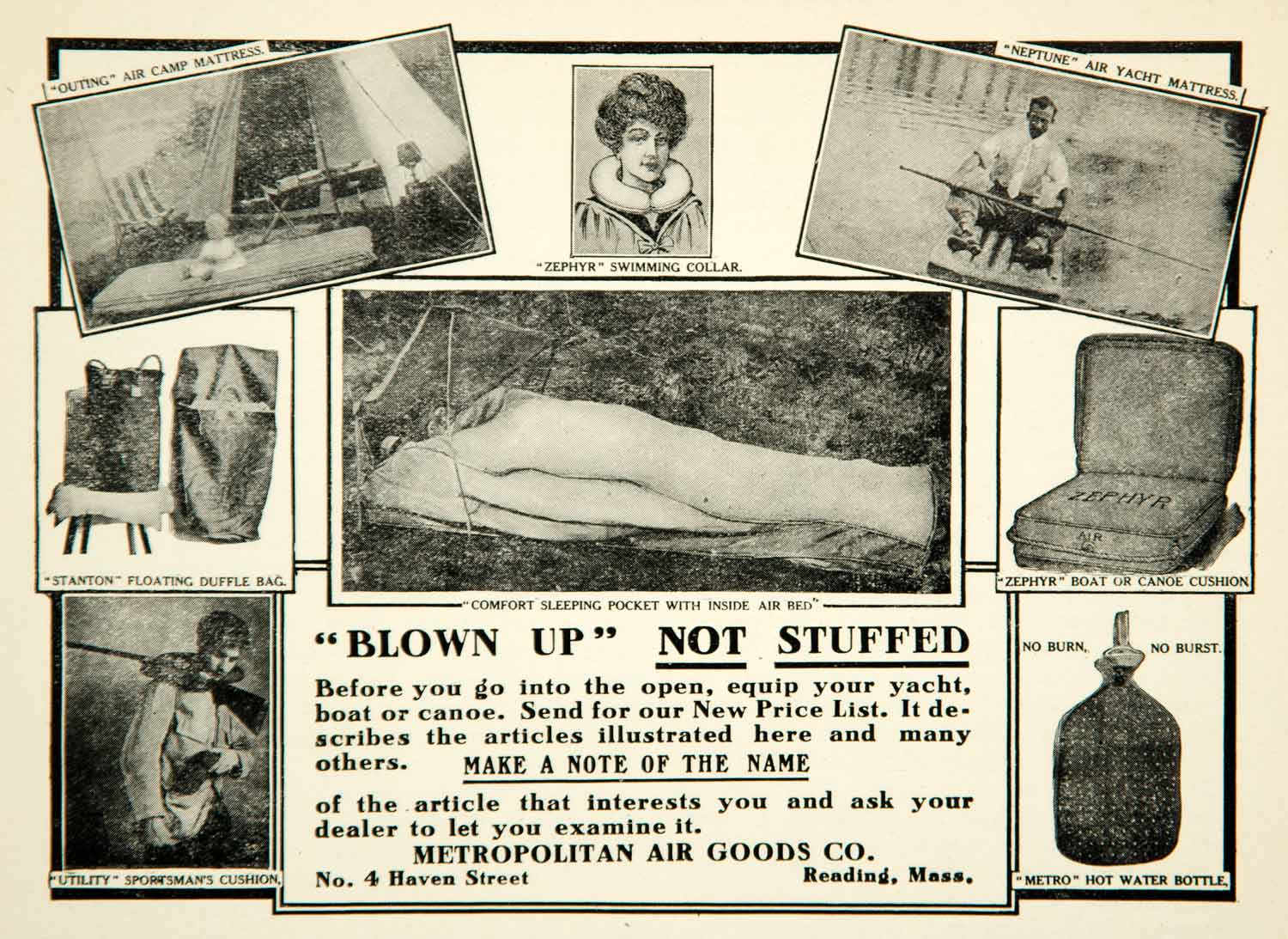 Keywords specific to this image: Vintage Advertising, Neptune, Yacht, Zephyr, Canoe, Cushion, Seat, Water Bottle, Metro, Sportsman, Utility, Stantion, Floating, Duffle Bag, Woman, Oar, Paddle, Gun, Rifle, Hunter, Hunting, Hunt, Camping, Baby, Sleeping Pocket, Bed, Swimming Collar, Massachusetts, Blown Up, Inflatable, Equipment